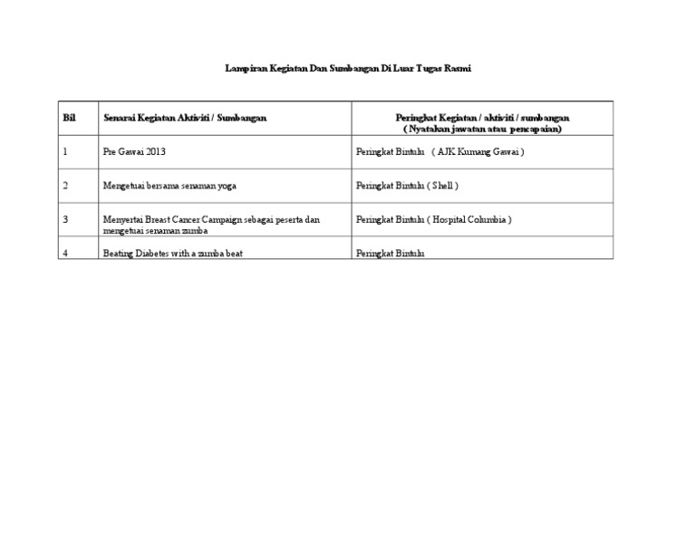 2 kegiatan luar sekolah ini mempunyai sasaran sebagai berikut. KEGIATAN DAN SUMBANGAN DI LUAR TUGAS RASMILATIHAN Senarai kegiatanaktivitisumbangan Peringkat kegiatanaktivitisumbangan nyatakan jawatan atau. Adapun kegiatan yang menjadi agenda acuan satuan pendidikan yang melaksanakan Belajar di Luar Kelas adalah sebagai berikut.